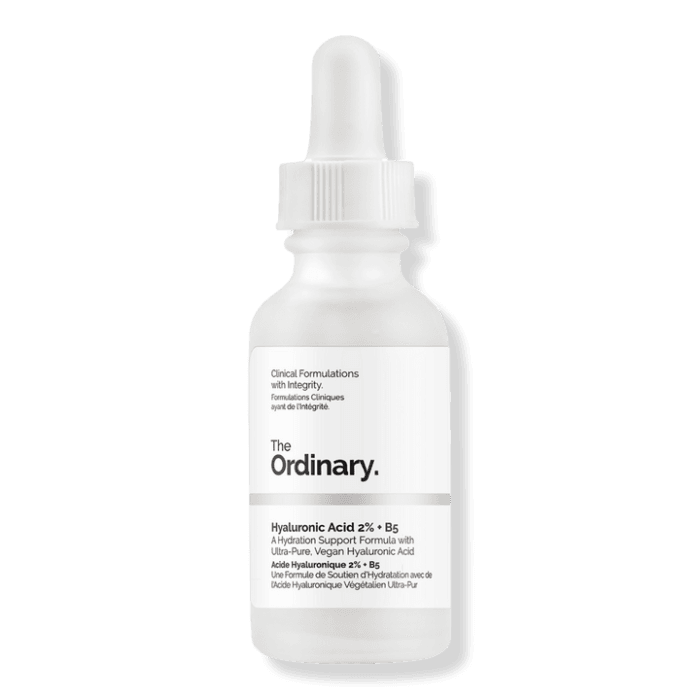 The Ordinary **Hyaluronic Acid 2% + B5** is a lightweight, hydrating serum that combines two powerful ingredients to improve skin moisture and texture:
